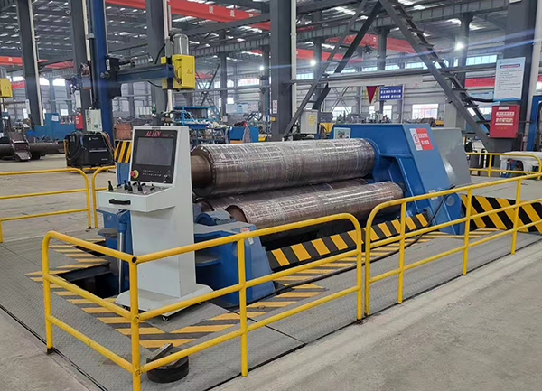 第二步是工作輥作進(jìn)給運動,即進(jìn)行三點彎曲,有的卷板機(jī)是上輥作壓下進(jìn)給,有的是下輥或側(cè)輥作向上的進(jìn)給運動,為敘述方便,根據(jù)相對運動的原理,將工件和下輥或側(cè)輥看作靜止不動的,上輥作壓下運動:卷圓筒工件上輥壓下時與下輥平行,卷錐筒工件上輥壓下時與下輥傾斜:壓下量越多,工件與上輥接觸的母線及附近曲率越大;第三步是通過工作輥的回轉(zhuǎn)運動讓工件回轉(zhuǎn),同時保證上輥的壓下量不變,使工件的每一個母線具有相同的曲率或曲率分布,成為圓筒和錐筒。